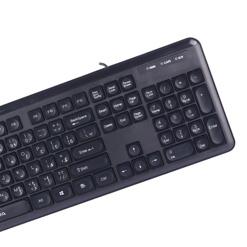 دارای 104 کلید فیزیکی با حروف حک شده فارسی، طراحی شده به صورت ارگونومیک با قابلیت استفاده از هر دو دست