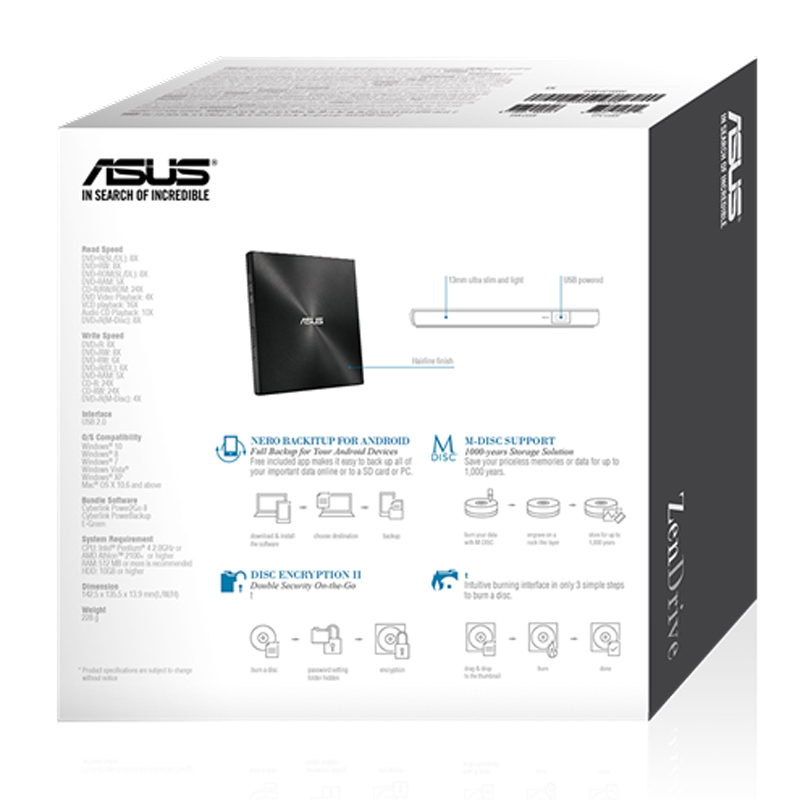 طراحی نسبتا باریک با قابلیت حمل آسان و بدنه ای محکم ساخته شده از متریال مرغوبنوع درایو نوری DVD با پشتیبانی از دیسک های ۸ و ۱۲ سانتی متری و زمان دسترسی تصادفی ۱۶۰ میلی ثانیهاتصال به کامپیوتر، لپ تاپ و دیگر دستگاه ها از طریق پورت USB 2.0 و پشتیبانی از قابلیت Plug And Play بدون نیاز به نصب درایور و یا نرم افزار خاصیپشتیبانی از خواندن و نوشتن دیسک های M-DISC، نرخ سرعت خواندن و نوشتن DVD معادل ۸X و میزان سرعت خواندن CD برابر با ۴۸X و نوشتن آن معادل ۲۴Xسازگاری با سیستم عامل های ویندوز، مک و پشتیبانی از برنامه های CyberLink Power2Go 8 ،CyberLink PowerBackup 2.6 ،Nero BackItUp و E-Greenتامین انرژی توسط رابط USB و از طریق پورت USB، قابلیت رمزگذاری و مخفی سازی فایل ها جهت بالا بردن امنیت در نگهداری داده های ذخیره شده